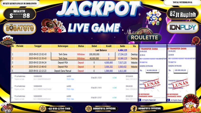 BOBATOTO – Selamat kepada User id : S*****88 Telah berhasil mendapatkan kemenangan besar pada permainan LIVE CASINO ROULETTE MACAU Dengan kemenangan Sebesar Rp.82,000,000,-. Setelah mengisi formulir withdraw dengan kurung waktu hanya 5 – 10 menit pihak bobatoto sudah melakukan transfer kepada pemilik Userid dan dana sudah dapat di cairkan oleh pemenang. Bukti pembayaran yang kami berikan merupakan bukti pembayaran yang SAH / VALID yang langung di dapatkan melaui tanda transfer transaksi dari Bank yang di tuju.