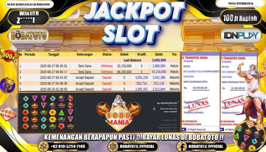 BOBATOTO – Selamat kepada User id : Z*****I Telah berhasil mendapatkan kemenangan besar pada permainan  SLOT 5000X MANIA  Dengan kemenangan Sebesar Rp.100,000,000,-. Setelah mengisi formulir withdraw dengan kurung waktu hanya 5 – 10 menit pihak bobatoto sudah melakukan transfer kepada pemilik Userid dan dana sudah dapat di cairkan oleh pemenang. Bukti pembayaran yang kami berikan merupakan bukti pembayaran yang SAH / VALID yang langung di dapatkan melaui tanda transfer transaksi dari Bank yang di tuju.