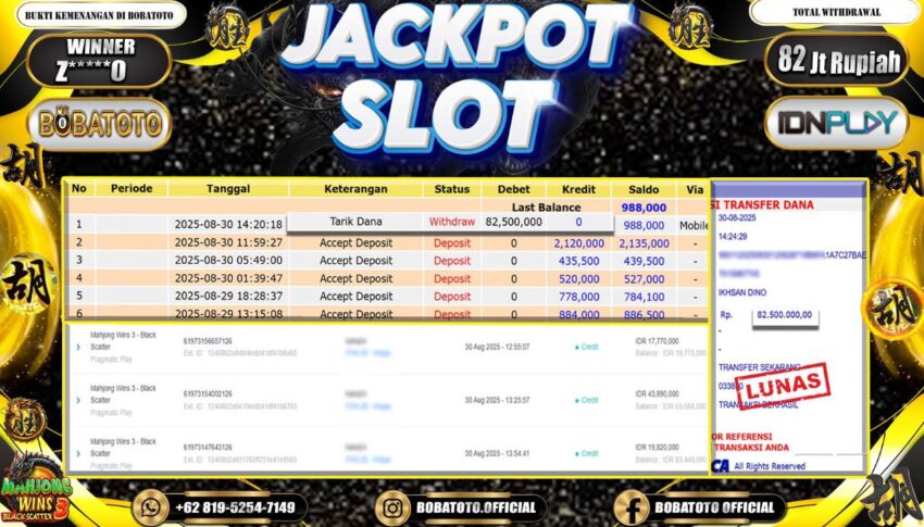 BOBATOTO – Selamat kepada User id :Z*****0 Telah berhasil mendapatkan kemenangan besar pada permainan SLOT MAHJONG WINS-3 BLACK SCATTER Dengan kemenangan Sebesar Rp.82,000,000-. Setelah mengisi formulir withdraw dengan kurung waktu hanya 5 – 10 menit pihak bobatoto sudah melakukan transfer kepada pemilik Userid dan dana sudah dapat di cairkan oleh pemenang. Bukti pembayaran yang kami berikan merupakan bukti pembayaran yang SAH / VALID yang langung di dapatkan melaui tanda transfer transaksi dari Bank yang di tuju.