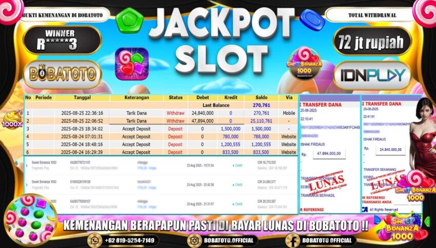 BOBATOTO – Selamat kepada User id : R*****3 Telah berhasil mendapatkan kemenangan besar pada permainan SLOT SWEET BONANZA 1000 Dengan kemenangan Sebesar Rp.72,000,000,-. Setelah mengisi formulir withdraw dengan kurung waktu hanya 5 – 10 menit pihak bobatoto sudah melakukan transfer kepada pemilik Userid dan dana sudah dapat di cairkan oleh pemenang. Bukti pembayaran yang kami berikan merupakan bukti pembayaran yang SAH / VALID yang langung di dapatkan melaui tanda transfer transaksi dari Bank yang di tuju.