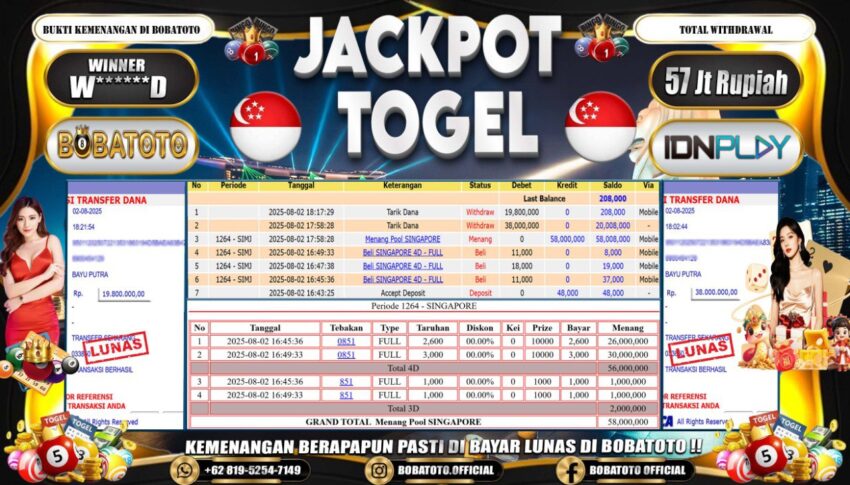 BOBATOTO – Selamat kepada User id : W******D Telah berhasil mendapatkan kemenangan besar pada permainan TOGEL SINGAPORE Dengan kemenangan Sebesar Rp.57,000,000,-. Setelah mengisi formulir withdraw dengan kurung waktu hanya 5 – 10 menit pihak bobatoto sudah melakukan transfer kepada pemilik Userid dan dana sudah dapat di cairkan oleh pemenang. Bukti pembayaran yang kami berikan merupakan bukti pembayaran yang SAH / VALID yang langung di dapatkan melaui tanda transfer transaksi dari Bank yang di tuju.