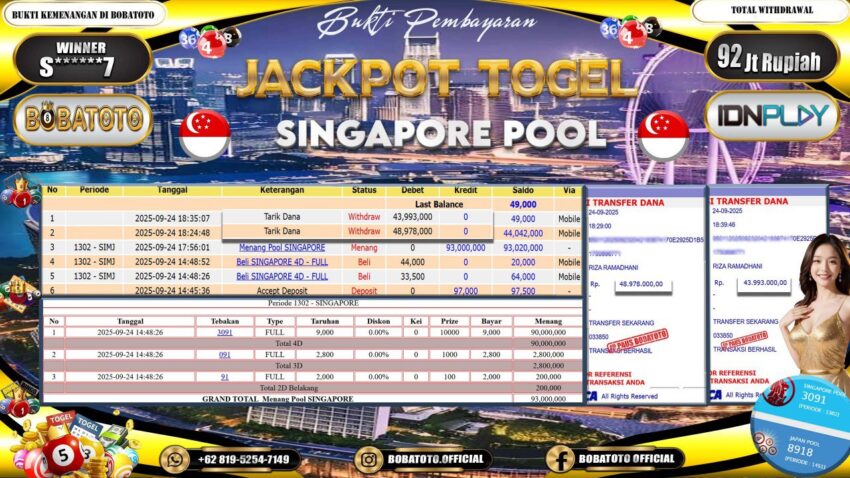 BOBATOTO – Selamat kepada User id : S*****7 Telah berhasil mendapatkan kemenangan besar pada permainan TOGEL SINGAPORE Dengan kemenangan Sebesar Rp.92,000,000,-. Setelah mengisi formulir withdraw dengan kurung waktu hanya 5 – 10 menit pihak bobatoto sudah melakukan transfer kepada pemilik Userid dan dana sudah dapat di cairkan oleh pemenang. Bukti pembayaran yang kami berikan merupakan bukti pembayaran yang SAH / VALID yang langung di dapatkan melaui tanda transfer transaksi dari Bank yang di tuju.