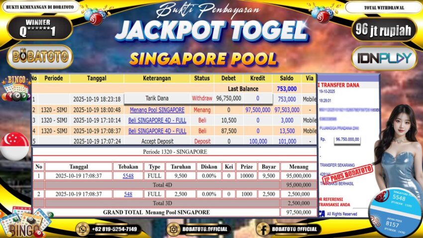 BOBATOTO – Selamat kepada User id : Q******1 Telah berhasil mendapatkan kemenangan besar pada permainan TOGEL SINGAPORE Dengan kemenangan Sebesar Rp.96,000,000,-. Setelah mengisi formulir withdraw dengan kurung waktu hanya 5 – 10 menit pihak bobatoto sudah melakukan transfer kepada pemilik Userid dan dana sudah dapat di cairkan oleh pemenang. Bukti pembayaran yang kami berikan merupakan bukti pembayaran yang SAH / VALID yang langung di dapatkan melaui tanda transfer transaksi dari Bank yang di tuju.
